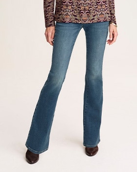 a modern spin on a trending shape, our jean features a perfectly proportioned flare leg and curved pockets. available in Curvy Fit.